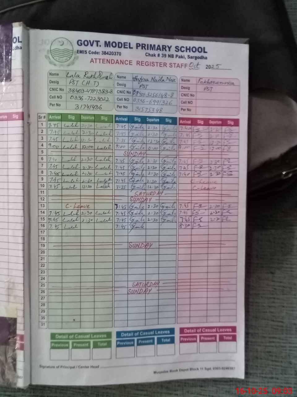 | CNIC | Full Name | Designation | R/C | Absence during last cal. month |