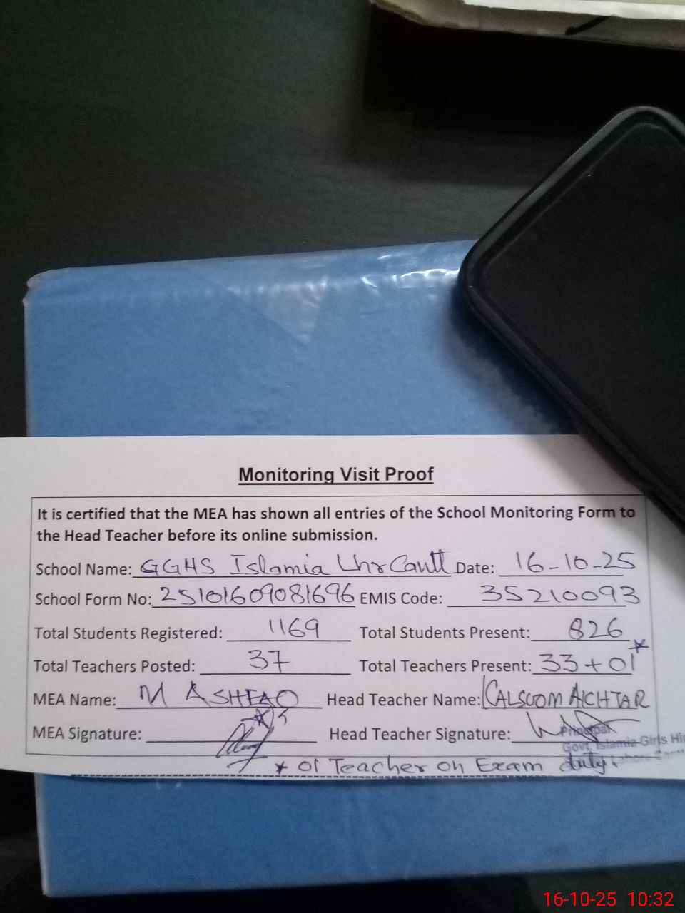| EMIS Code: 35210093 | Name of School: GGHS ISLAMIA LAHORE CANTT | |||