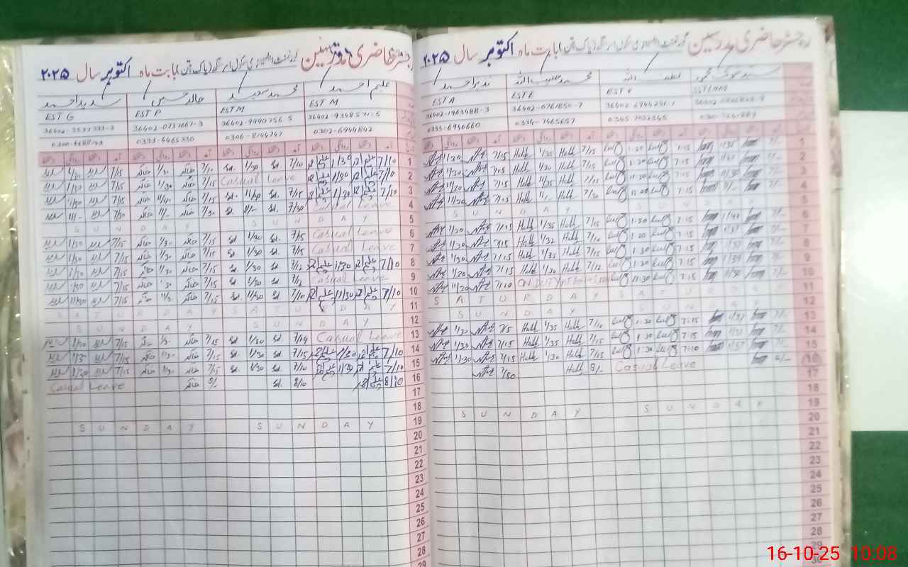 | CNIC | Full Name | Designation | R/C | Absence During Last Calender Month |