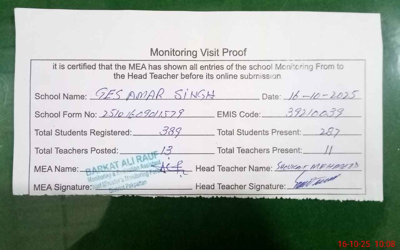 | Attendance Register | Head Teacher | MEA with School | Visit Proof |