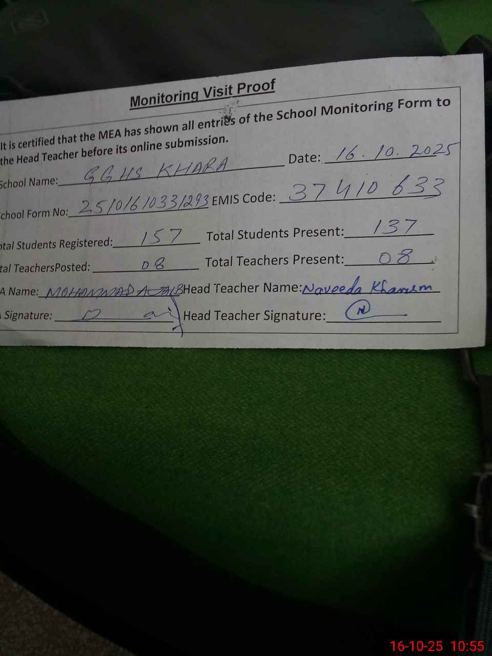 | Attendance Register | Head Teacher | MEA with School | Visit Proof |