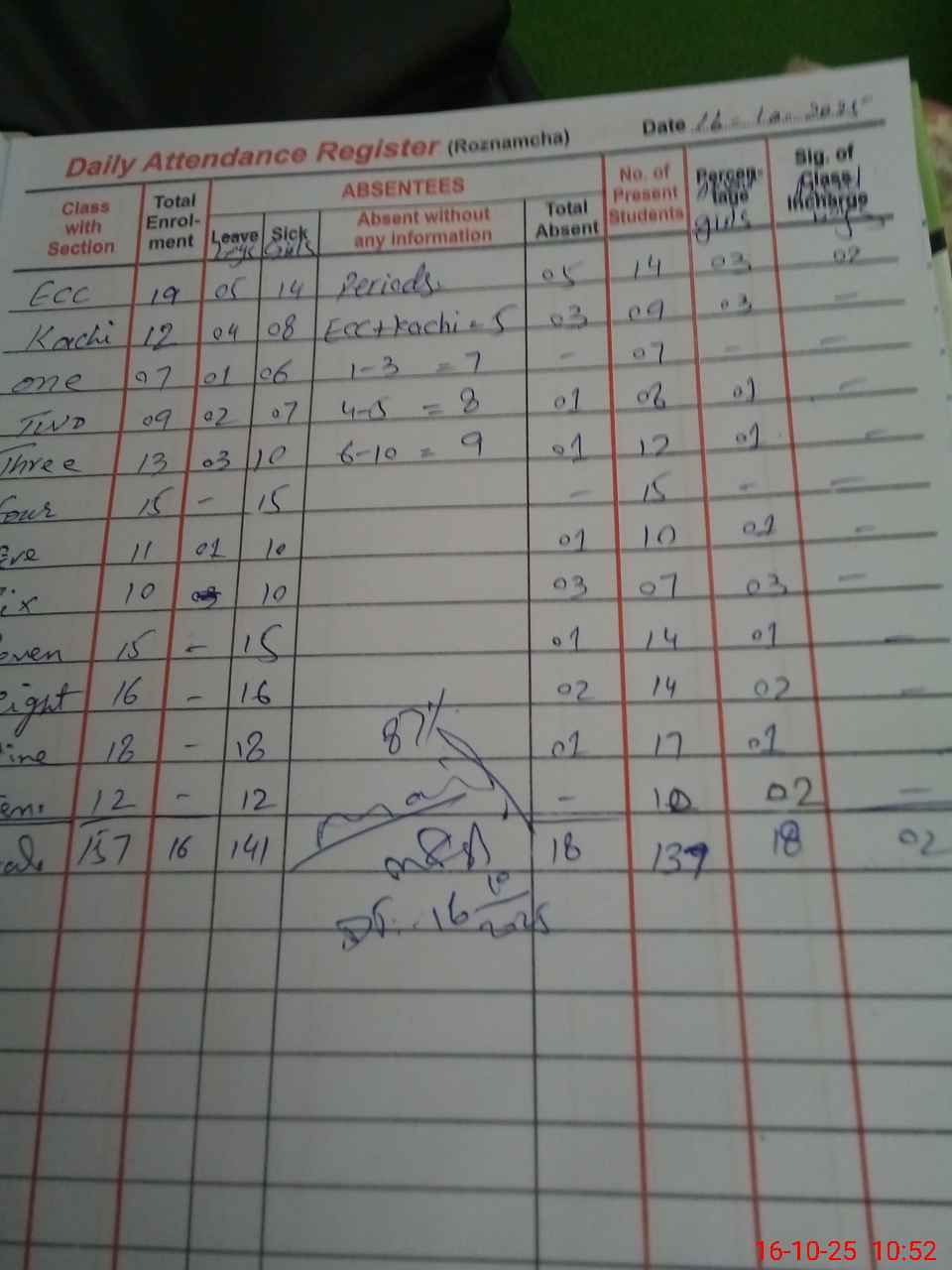 | Total Students Present | 14 | 0 | 9 | 7 | 8 | 12 | 15 | 10 | 7 | 14 | 14 | 17 | 10 | 137 | ||