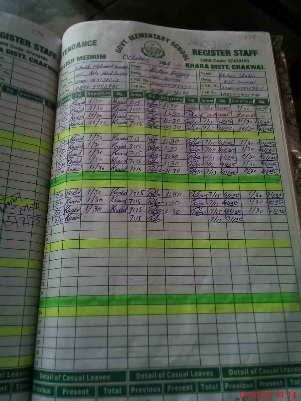 | CNIC | Full Name | Designation | R/C | Absence during last cal. month |