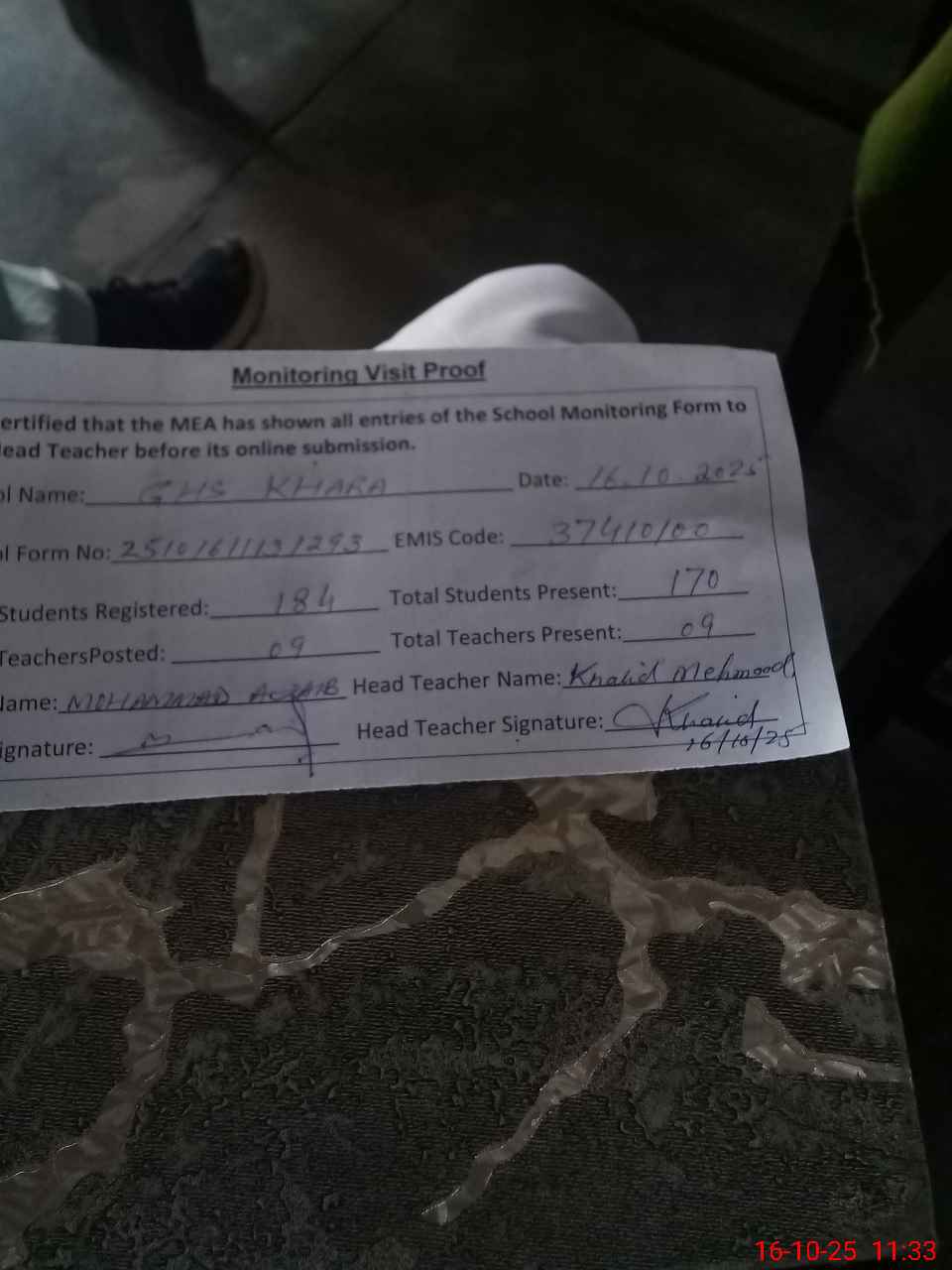 | Attendance Register | Head Teacher | MEA with School | Visit Proof |