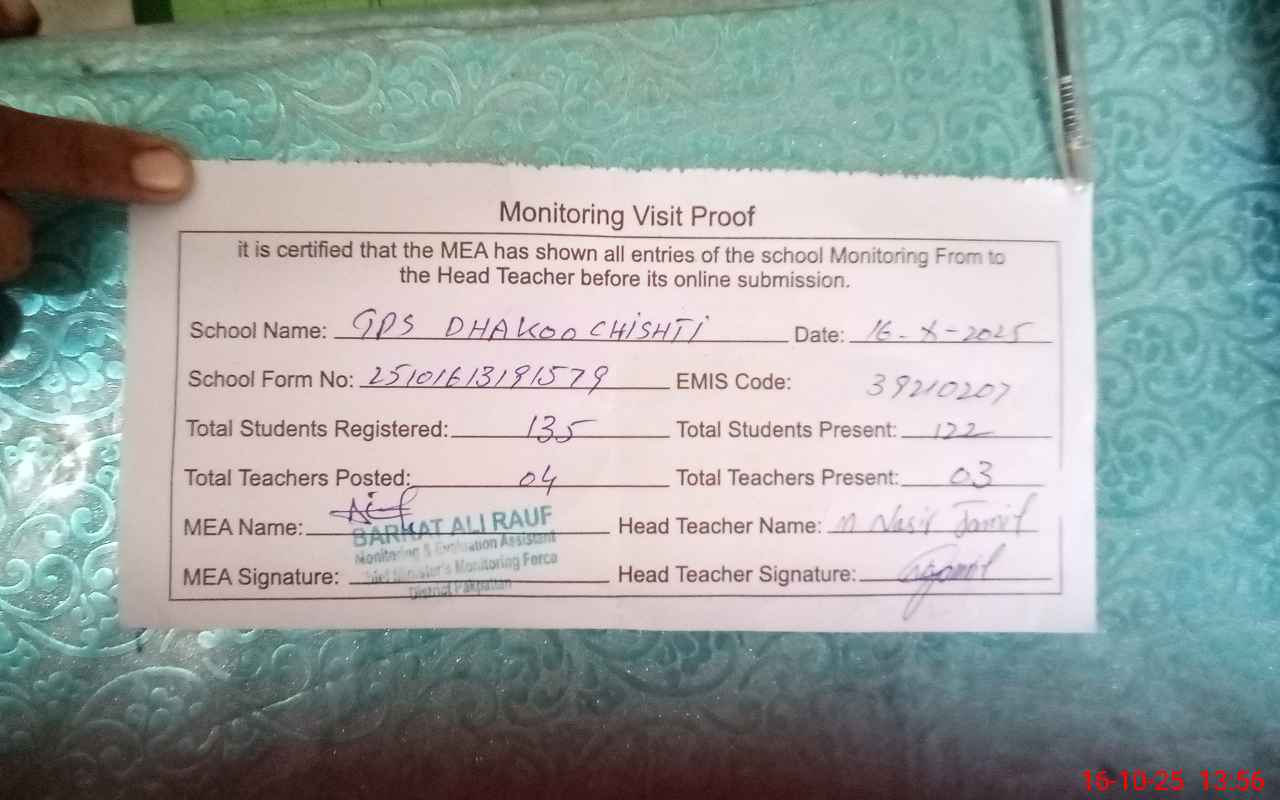 | EMIS Code: 39210207 | Name of School: GPS DHAKOO CHISHTI PO PAKPATTAN | |||