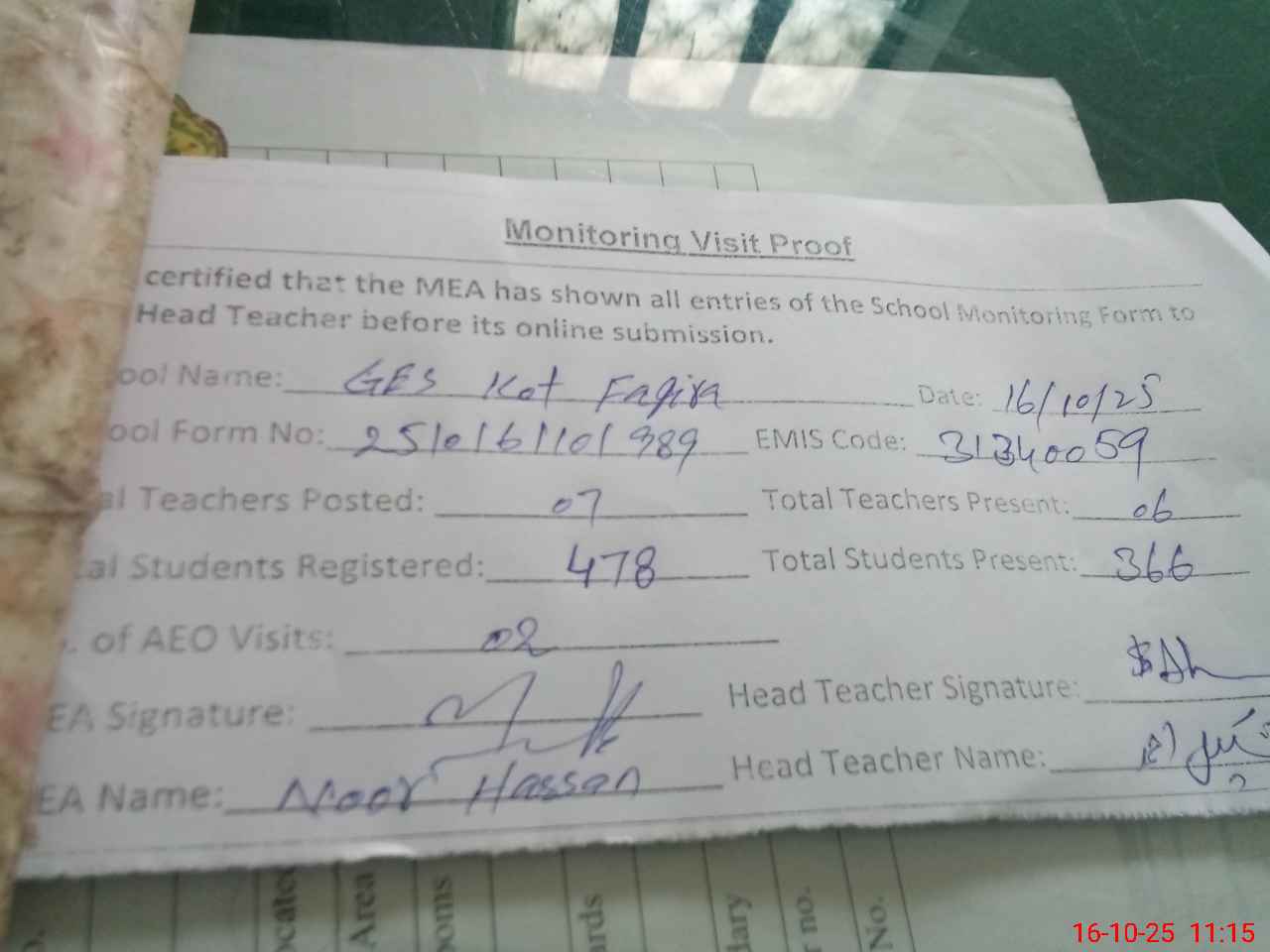 | Attendance Register | Head Teacher | MEA with School | Visit Proof |