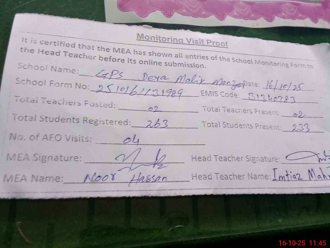 | Attendance Register | Head Teacher | MEA with School | Visit Proof |