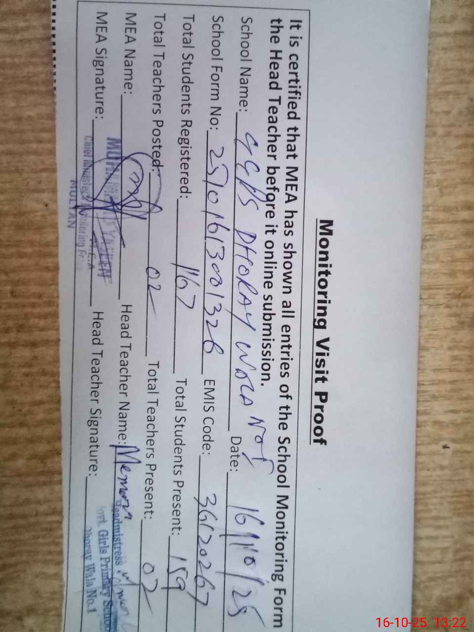 | Attendance Register | Head Teacher | MEA with School | Visit Proof |