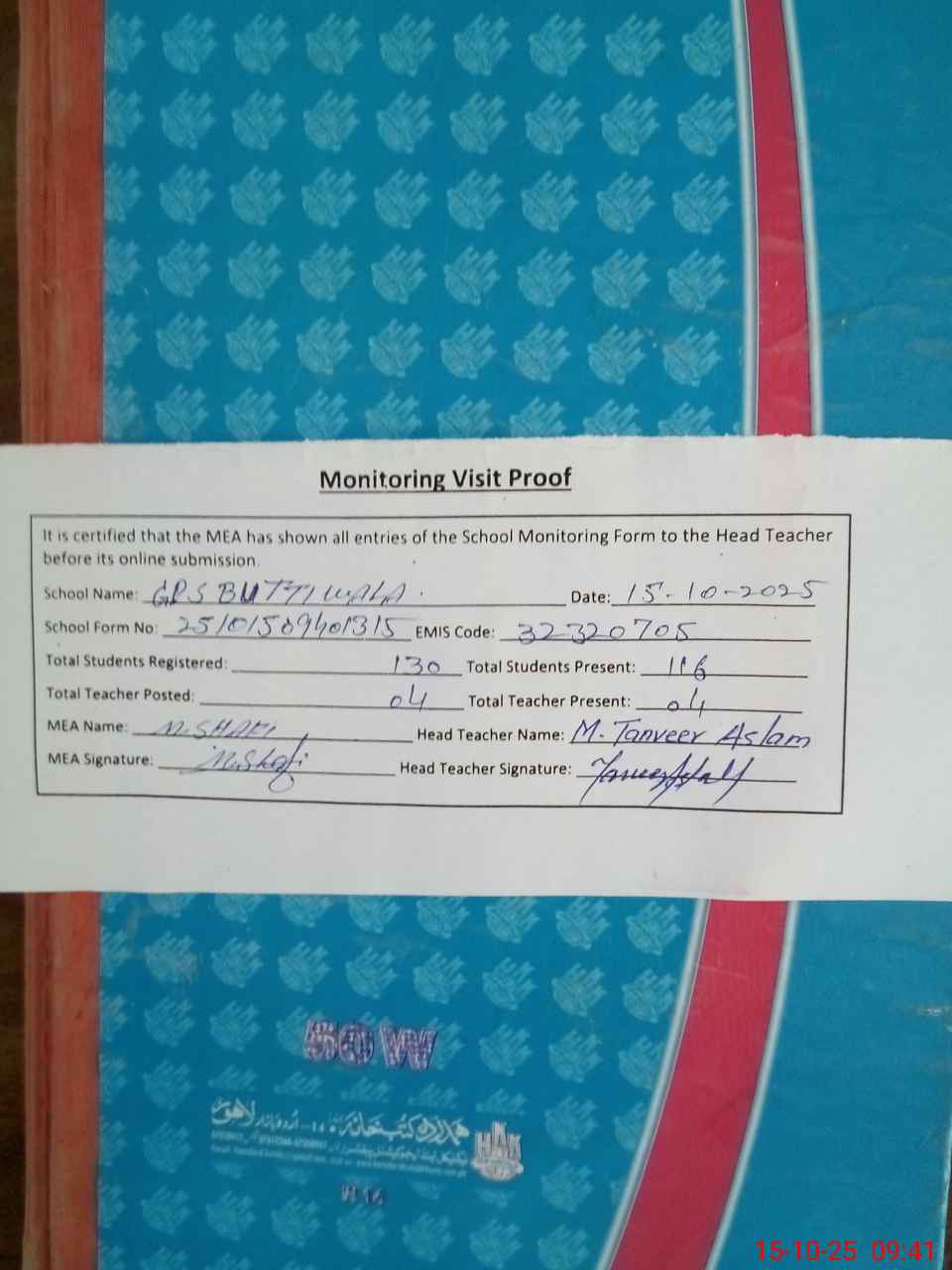 | Attendance Register | Head Teacher | MEA with School | Visit Proof |