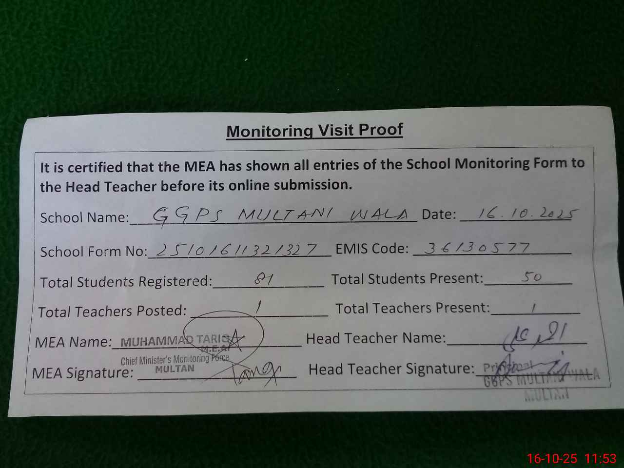 | EMIS Code: 36130577 | Name of School: GGPS MULTANI WALA P/O MULTANI WALA MULTAN | |||