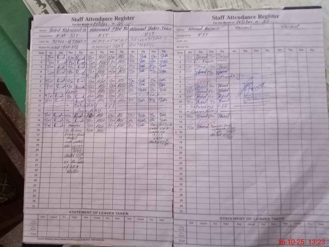 | CNIC | Full Name | Designation | R/C | Absence During Last Calender Month |