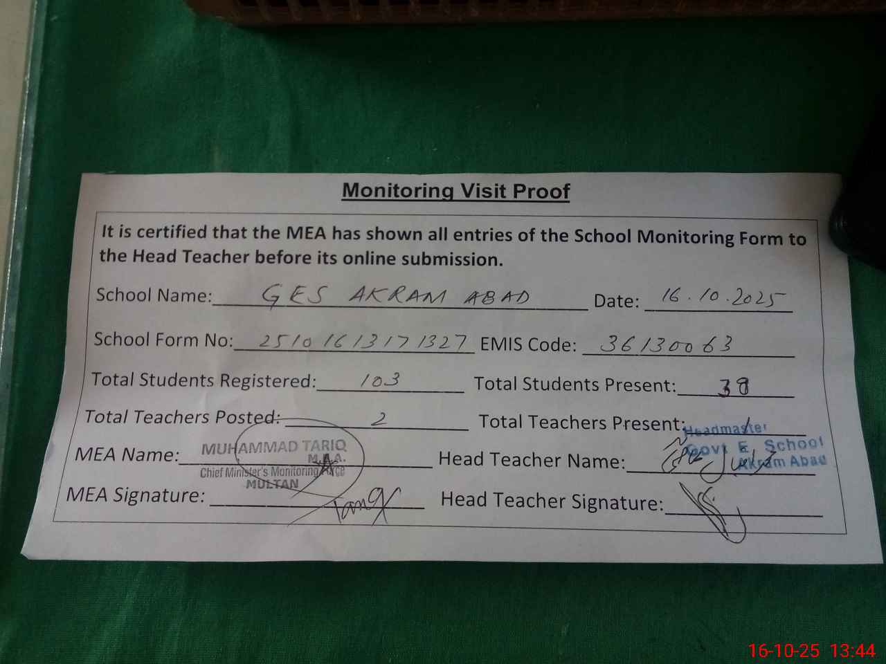 | Attendance Register | Head Teacher | MEA with School | Visit Proof |