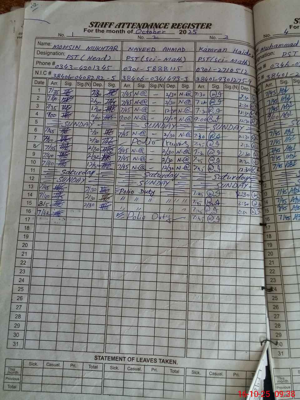 | CNIC | Full Name | Designation | R/C | Absence during last cal. month |