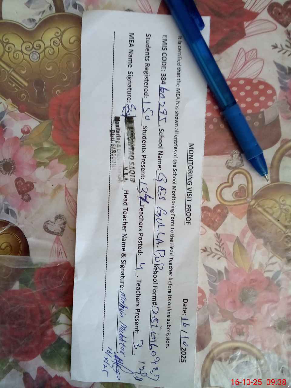 | Attendance Register | Head Teacher | MEA with School | Visit Proof |