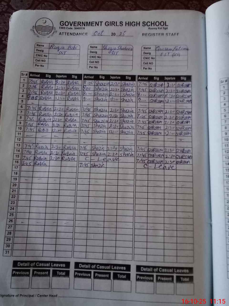 | CNIC | Full Name | Designation | R/C | Absence During Last Calender Month |