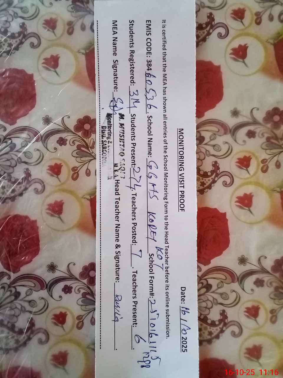 | Certified that this School was Inspected by the Undersigned MEA/DMO Today and the Information Stated Above is as Per Record. | |||||
