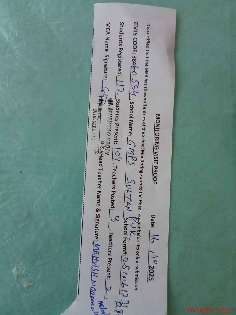 | EMIS Code: 38460554 | Name of School: GMPS SULTAN PUR | |||