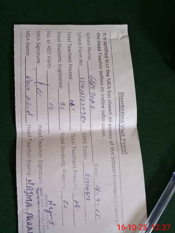 | Attendance Register | Head Teacher | MEA with School | Visit Proof |