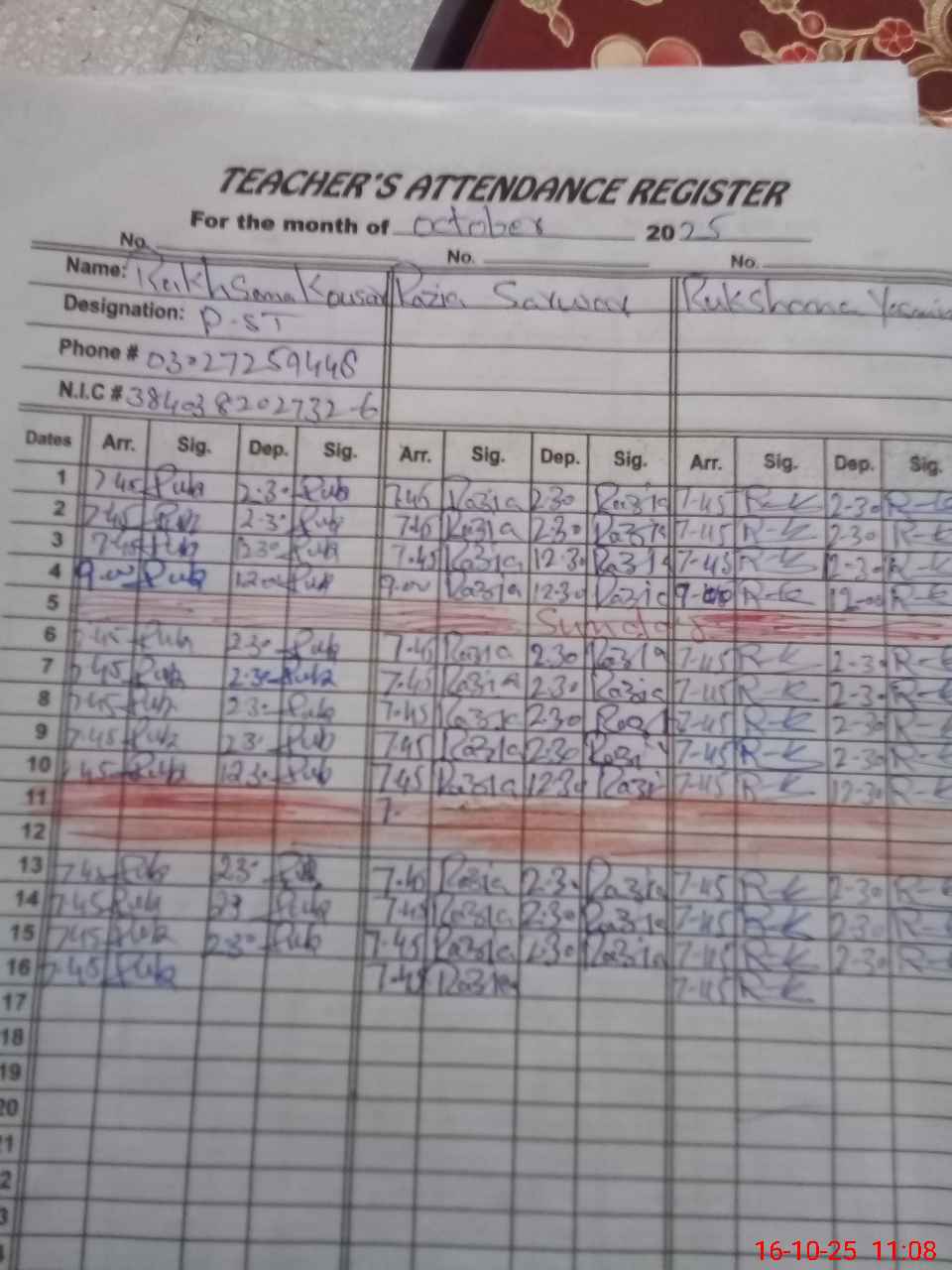 | CNIC | Full Name | Designation | R/C | Absence during last cal. month |