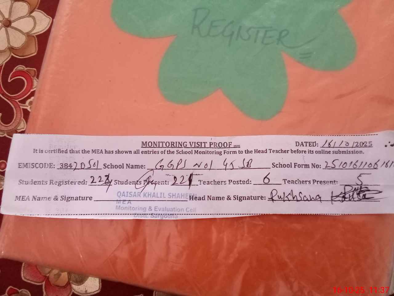 | Attendance Register | Head Teacher | MEA with School | Visit Proof |