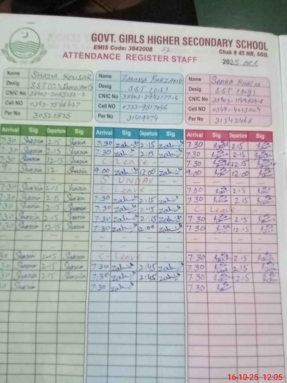 | CNIC | Full Name | Designation | R/C | Absence during last cal. month |