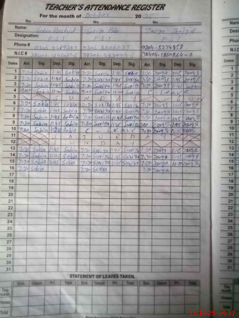 | CNIC | Full Name | Designation | R/C | Absence during last cal. month |
