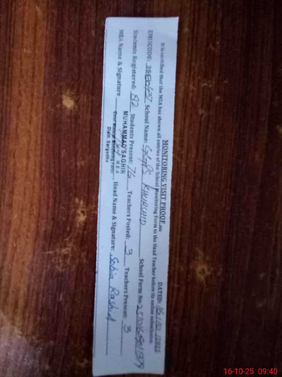 | Certified that this School was Inspected by the Undersigned MEA/DMO Today and the Information Stated Above is as Per Record. | |||||