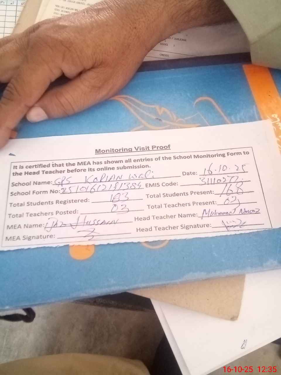 | Attendance Register | Head Teacher | MEA with School | Visit Proof |