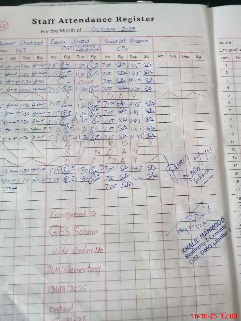 | CNIC | Full Name | Designation | R/C | Absence During Last Calender Month |