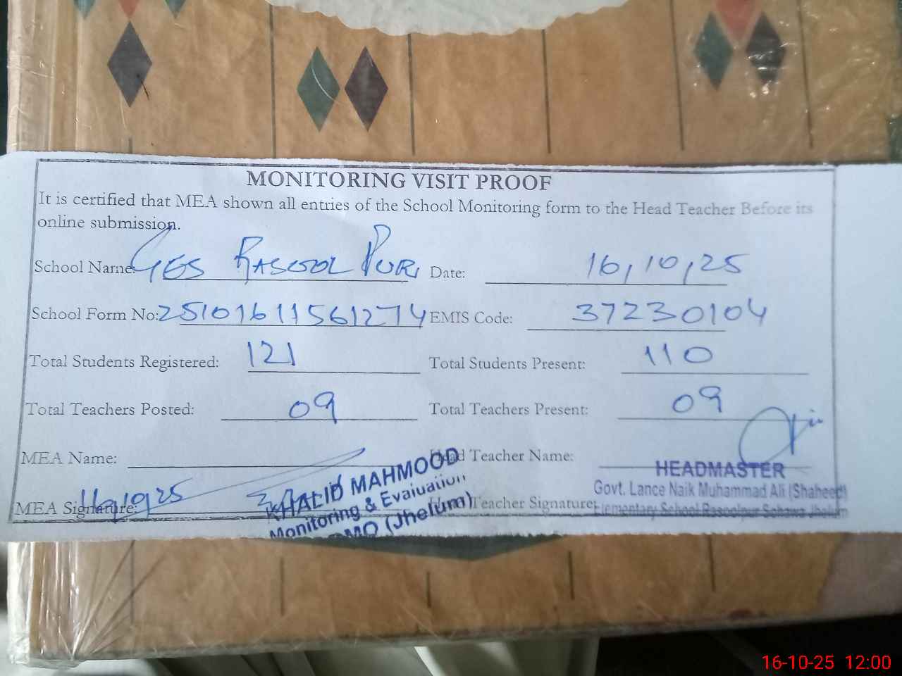 | Attendance Register | Head Teacher | MEA with School | Visit Proof |