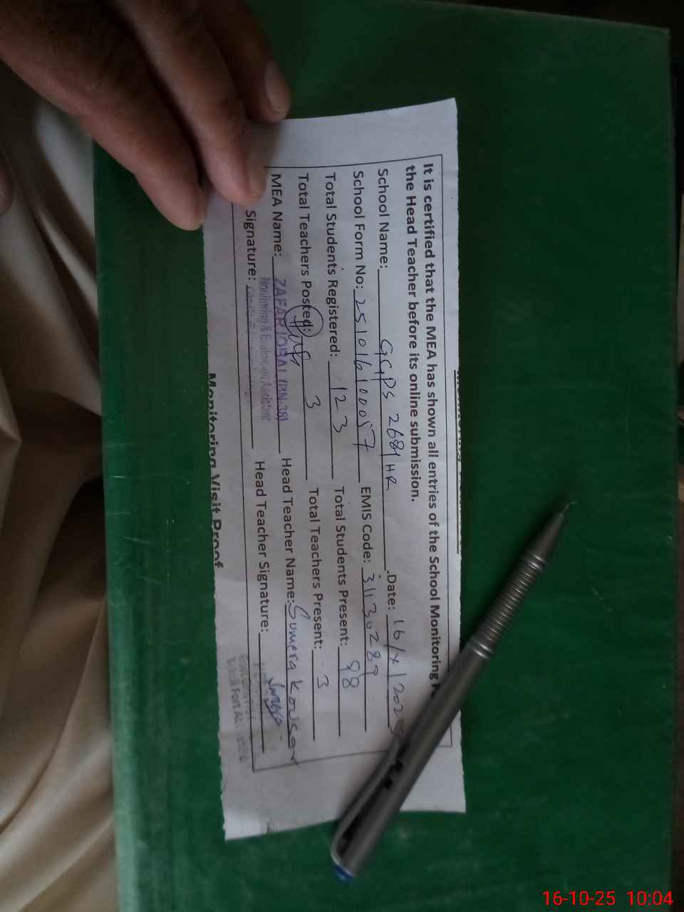 | Attendance Register | Head Teacher | MEA with School | Visit Proof |