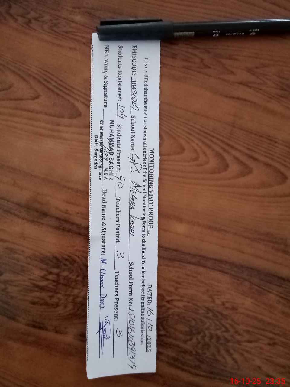 | Certified that this School was Inspected by the Undersigned MEA/DMO Today and the Information Stated Above is as Per Record. | |||||