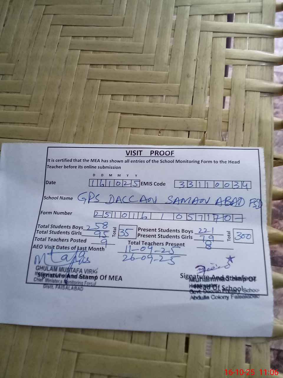 | EMIS Code: 33110034 | Name of School: GPS DACCAN SAMAN ABAD FSD | |||