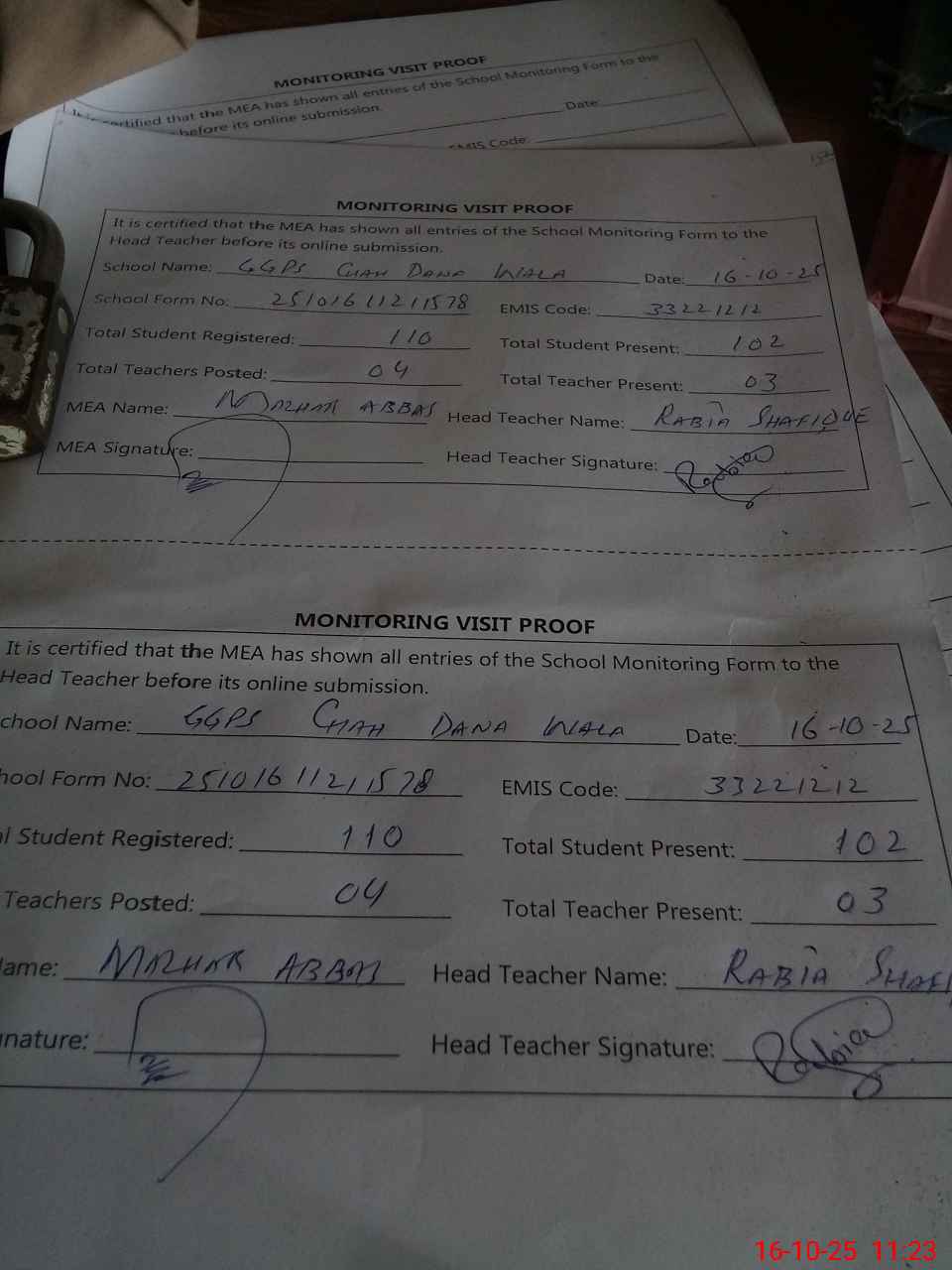 | Attendance Register | Head Teacher | MEA with School | Visit Proof |