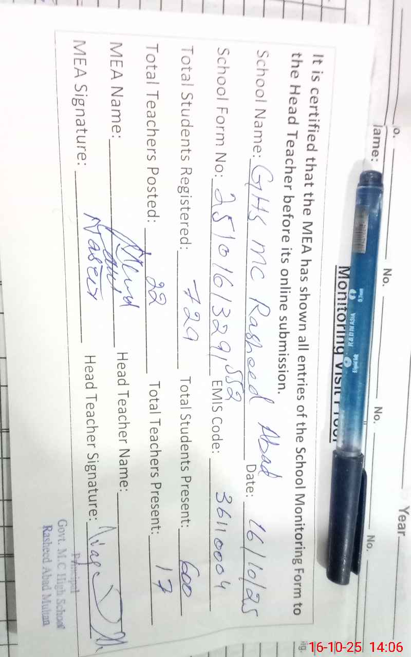 | EMIS Code: 36110004 | Name of School: GHS MC RASHEED ABAD MULTAN | |||