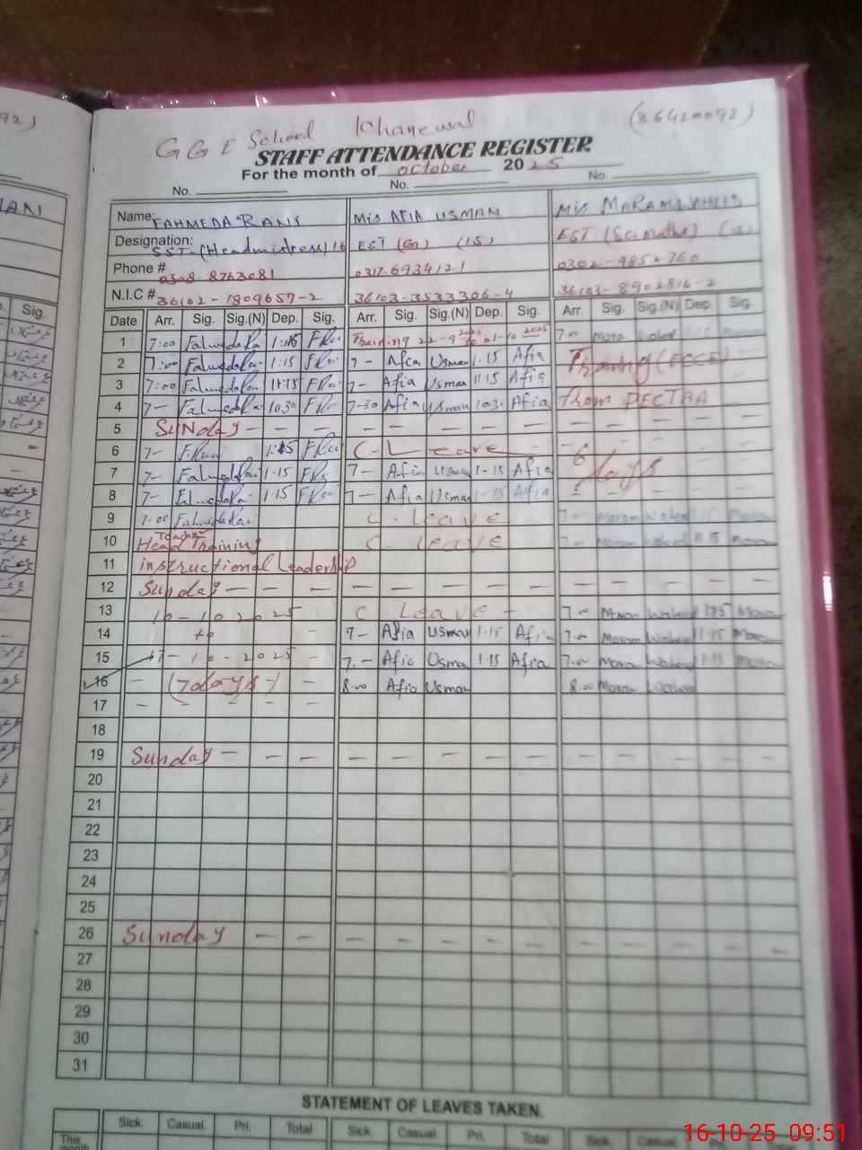| Name: Fe**** Ra**** Designation: (School Headmaster's/Headmistress's) SST (G) Phone/Cell Number: 03**** |