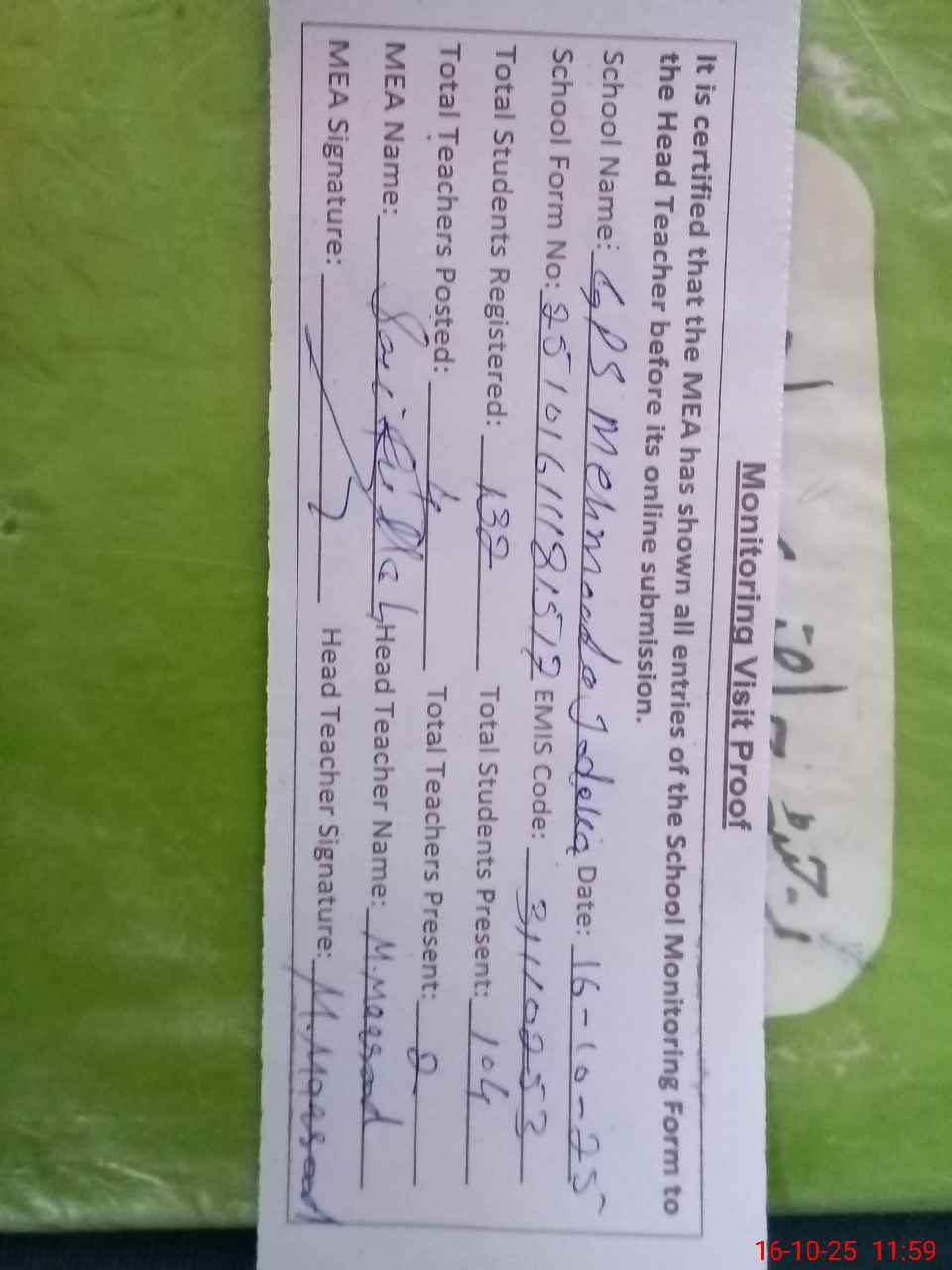 | Attendance Register | Head Teacher | MEA with School | Visit Proof |