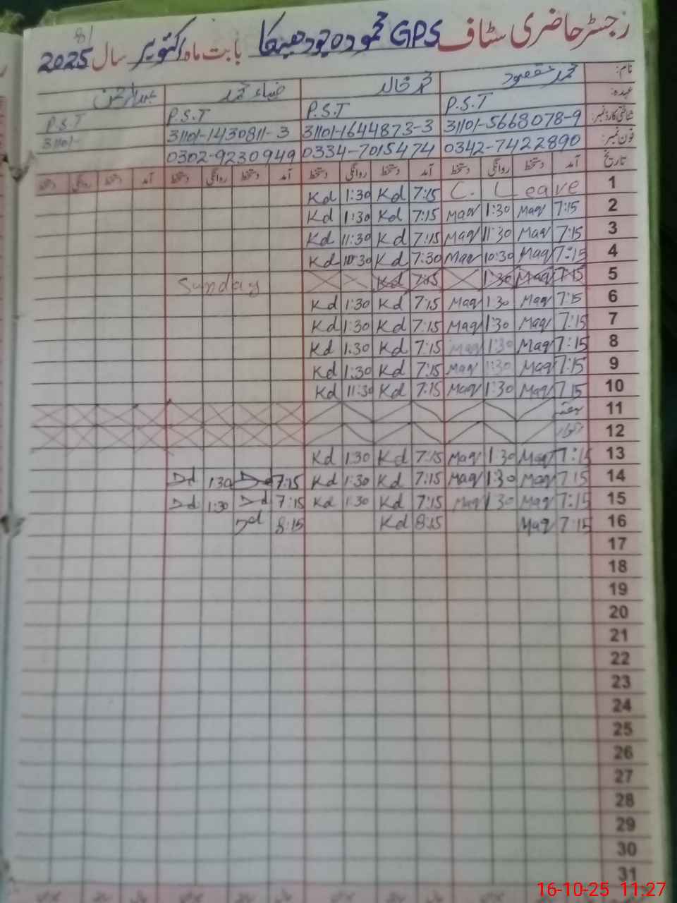 | CNIC | Full Name | Designation | R/C | Absence during last cal. month |