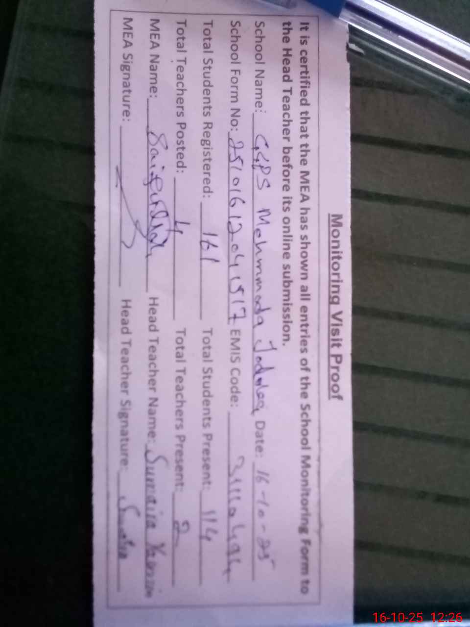 | Attendance Register | Head Teacher | MEA with School | Visit Proof |