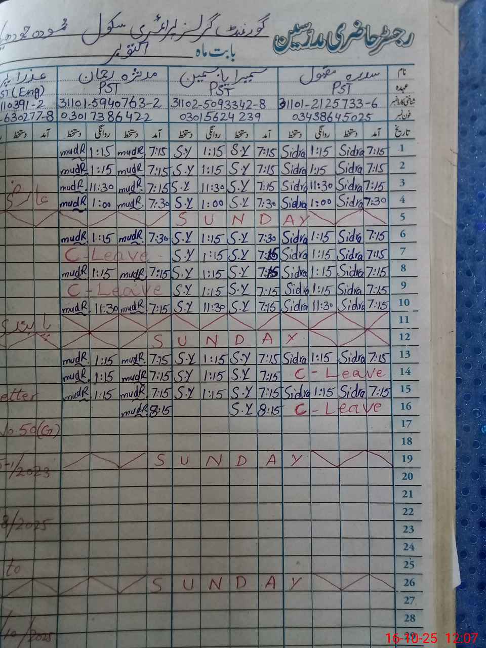 | CNIC | Full Name | Designation | R/C | Absence During Last Calender Month |