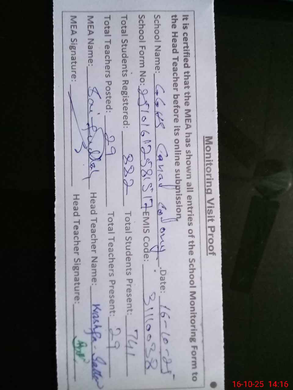| Certified that this School was Inspected by the Undersigned MEA/DMO Today and the Information Stated Above is as Per Record. | |||||