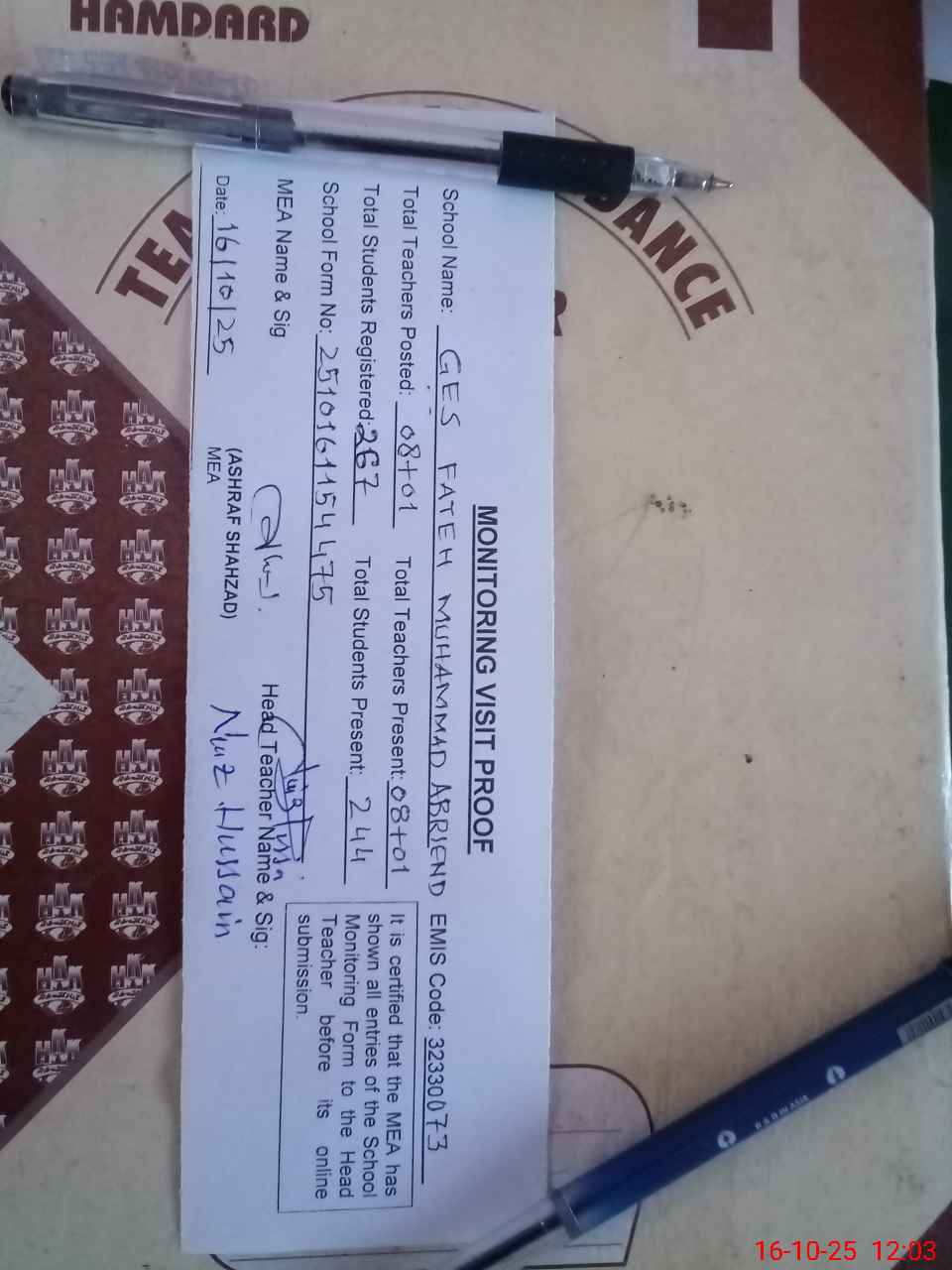 | Attendance Register | Head Teacher | MEA with School | Visit Proof |