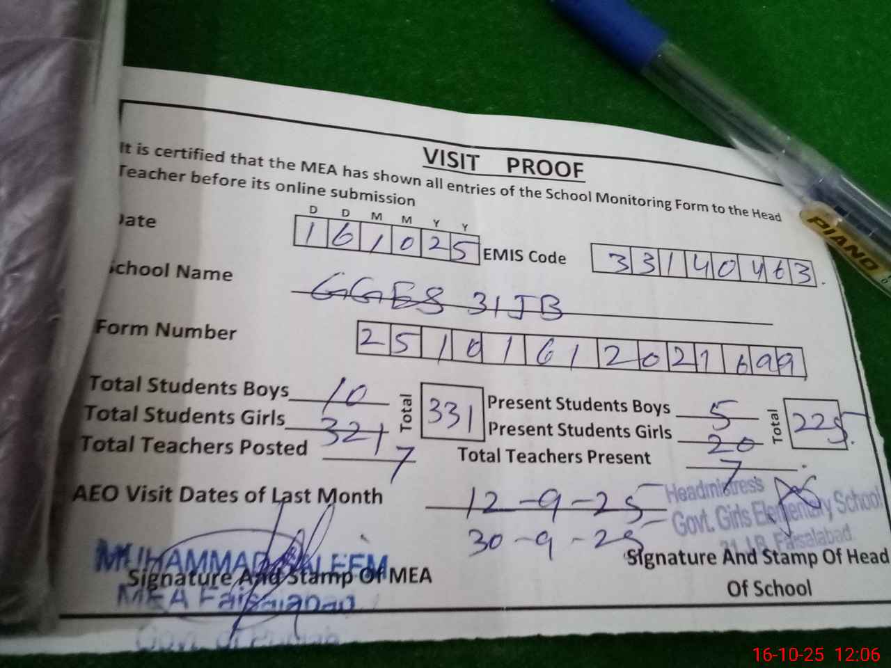 | Certified that this School was Inspected by the Undersigned MEA/DMO Today and the Information Stated Above is as Per Record. | |||||
