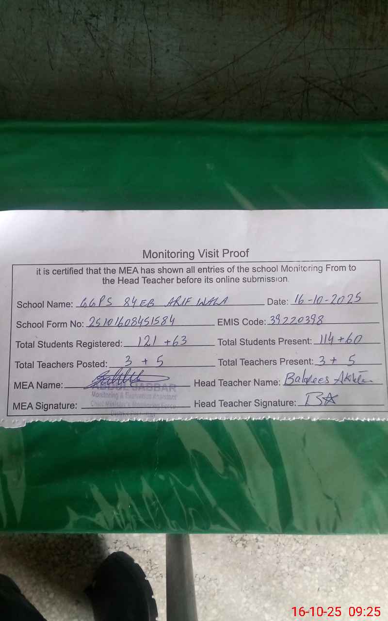| EMIS Code: 39220398 | Name of School: GGPS 84/EB ARIFWALA | |||