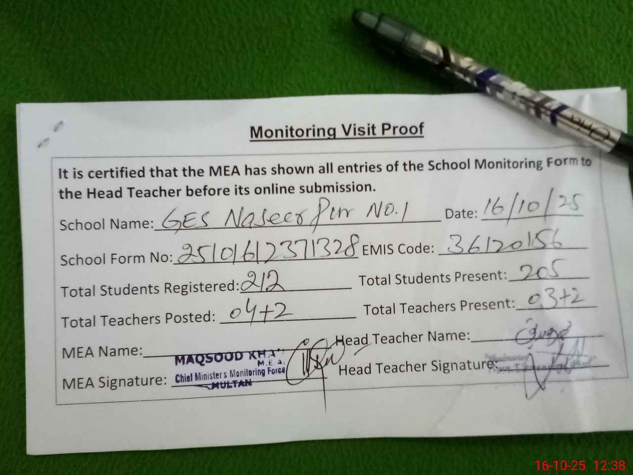| Monitoring Date: 16-10-2025 | Start Time: 16-10-2025 12:27 PM | End Time: 16-10-2025 12:38 PM | Name of MEA: MA**** ULHA**** KH**** | |