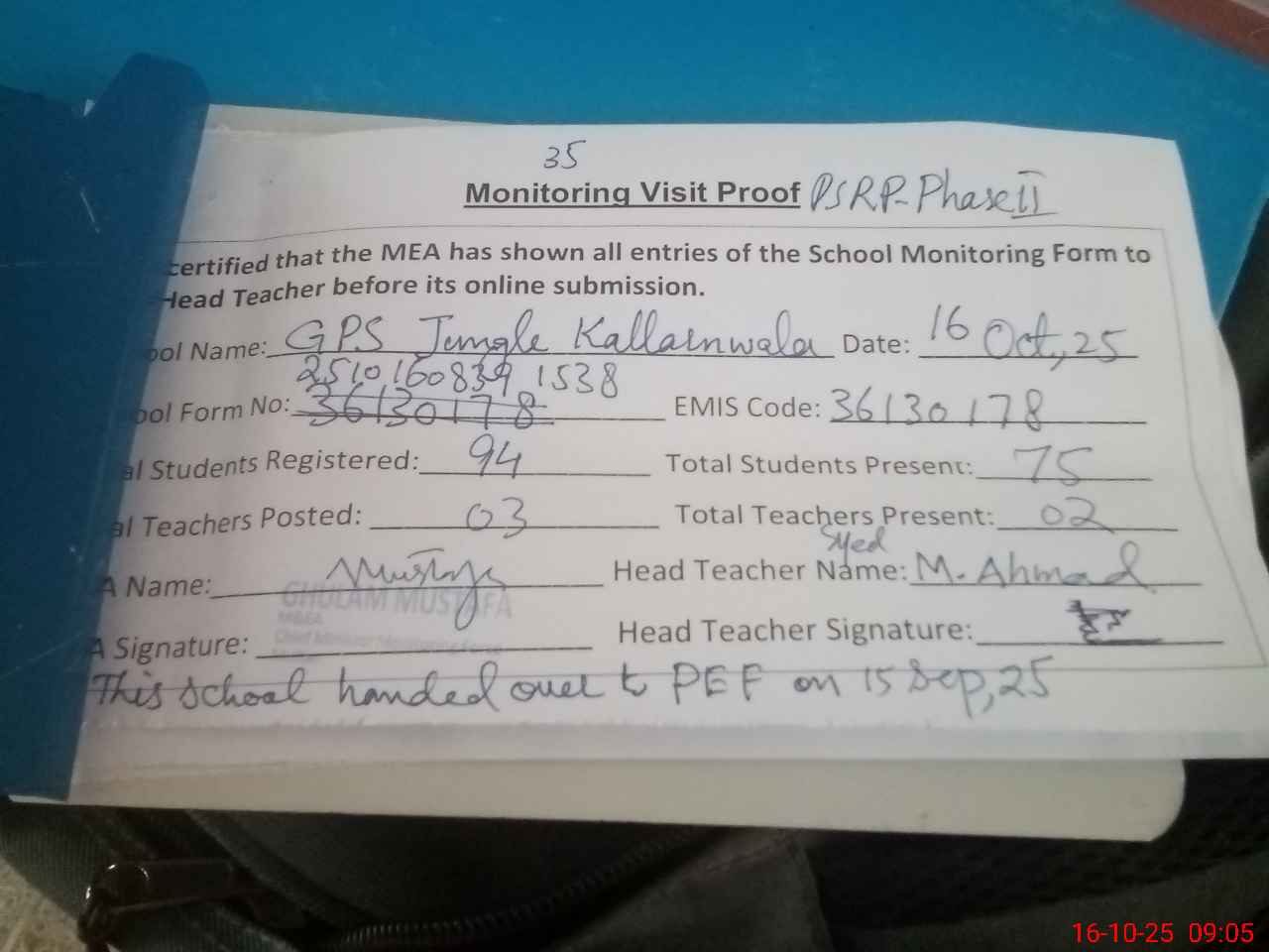 | Remarks (Use Separate Page if Required): This school has been handed over to PEF on 15 Sep 2025 | |||||