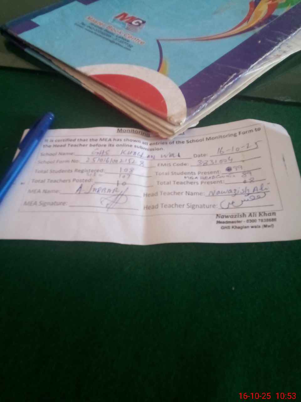 | Attendance Register | Head Teacher | MEA with School | Visit Proof |