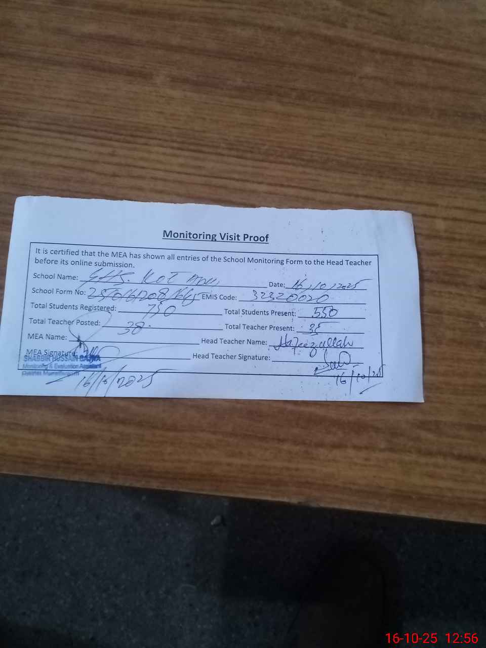 | Attendance Register | Head Teacher | MEA with School | Visit Proof |
