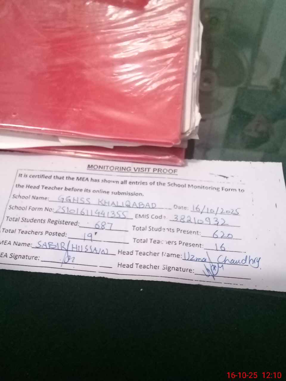 | Attendance Register | Head Teacher | MEA with School | Visit Proof |