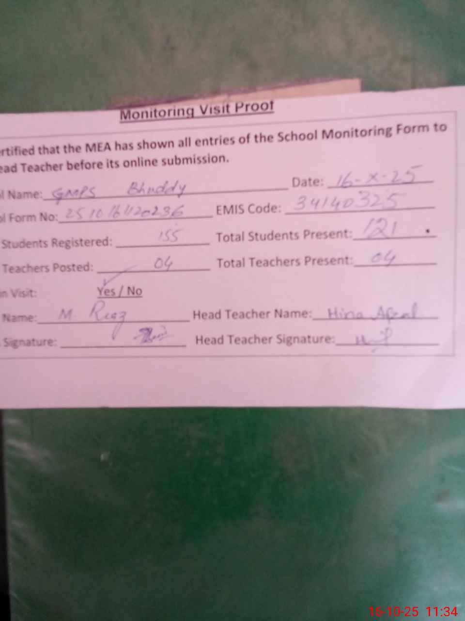 | Attendance Register | Head Teacher | MEA with School | Visit Proof |